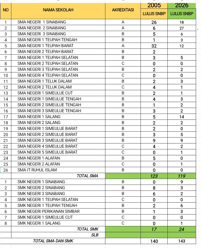 Sementara itu, pada jenjang SMK, SMKN 1 Sinabang menempati urutan pertama dengan 9 siswa yang lulus ke PTN. Posisi kedua ditempati SMKN 1 Teupah Tengah dengan 6 siswa.