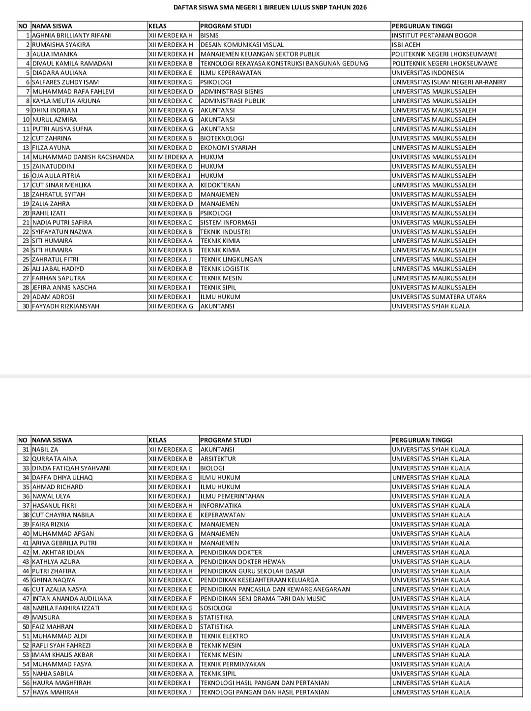 BIREUEN, Asakita.news, – Sebanyak 57 siswa berhasil lulus Seleksi Nasional Berdasarkan Prestasi (SNBP) tahun 2026 dan diterima di berbagai perguruan tinggi negeri (PTN) ternama di Indonesia.