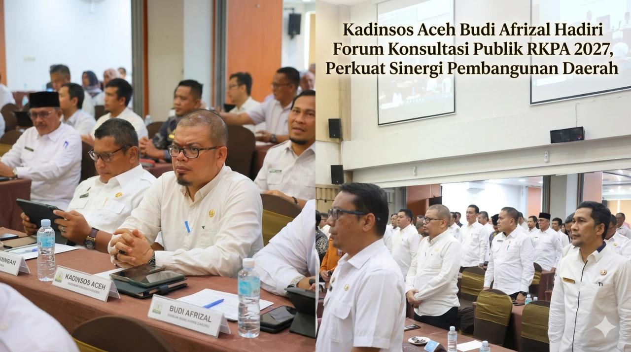 ASAKITA.NEWS | BANDA ACEH – Kepala Dinas Sosial Aceh, Budi Afrizal, S.KM., M.KM., menghadiri Forum Konsultasi Publik Rencana Kerja Pemerintah Aceh (RKPA) Tahun 2027 sebagai bagian dari upaya memperkuat sinergi lintas sektor dalam pembangunan daerah.