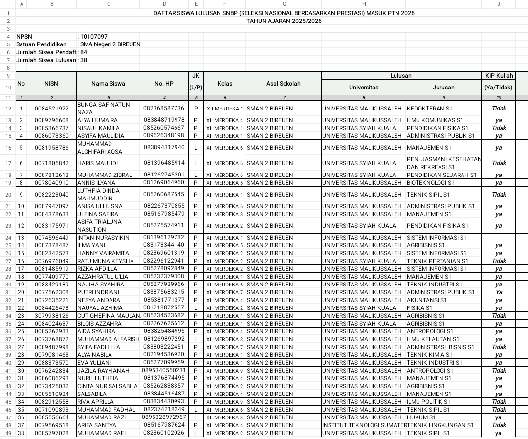 Keberhasilan ini semakin mempertegas kualitas pendidikan di SMAN 2 Bireuen yang terus menunjukkan tren positif setiap tahunnya dalam mengantarkan siswa ke perguruan tinggi melalui jalur prestasi.