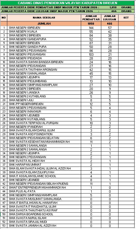 Berdasarkan data Cabang Dinas Pendidikan, mencatat, sekolah dengan jumlah kelulusan tertinggi diraih oleh SMA Negeri 1 Bireuen dengan 57 siswa. Posisi kedua ditempati SMA Negeri 1 Kuala dengan 42 siswa, disusul SMA Negeri 2 Bireuen sebanyak 38 siswa.