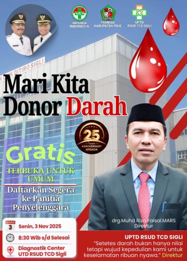 ASAKITA.NEWS | SIGLI — Dalam rangka memperingati 25 Tahun Arsada (Asosiasi Rumah Sakit Daerah), UPTD RSUD TCD Sigli menggelar kegiatan Donor Darah Gratis yang terbuka untuk umum pada Senin, 3 November 2025, bertempat di Diagnostik Center RSUD TCD Sigli. Kegiatan sosial kemanusiaan ini menjadi momentum penting bagi masyarakat untuk berpartisipasi langsung dalam aksi nyata menyelamatkan nyawa sesama melalui kepedulian sosial.