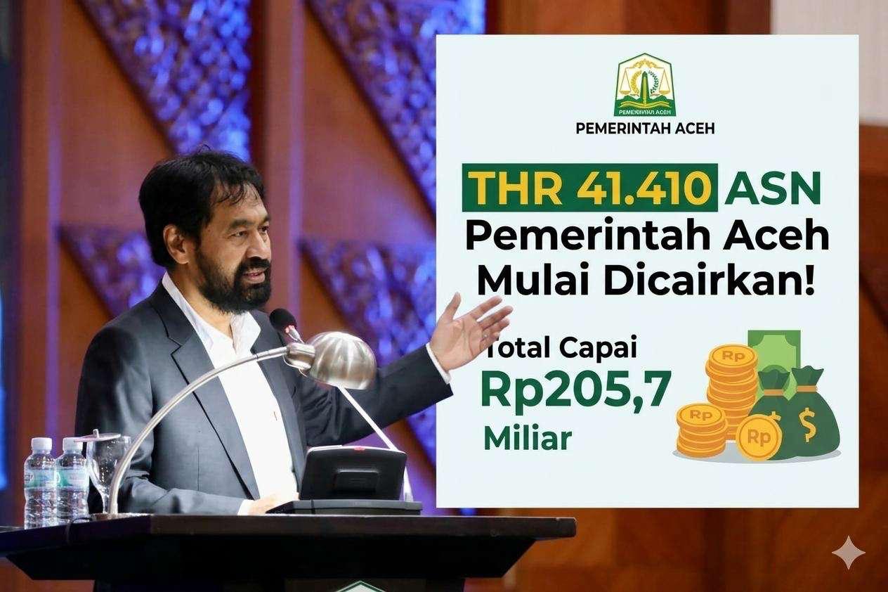Asakita.News | BANDA ACEH — Pemerintah Aceh mulai mencairkan Tunjangan Hari Raya (THR) bagi Aparatur Sipil Negara (ASN) di lingkungan Pemerintah Aceh sejak Jumat (13/3/2026). Pencairan tersebut mencakup Pegawai Negeri Sipil (PNS), Pegawai Pemerintah dengan Perjanjian Kerja (PPPK), serta PPPK paruh waktu.