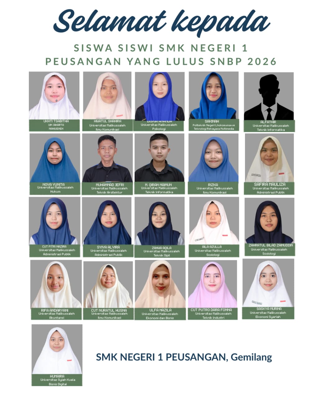 Bireuen – Asakita.news,– Prestasi membanggakan kembali ditorehkan oleh SMK Negeri 1 Peusangan. Sebanyak 21 siswa sekolah tersebut berhasil lulus melalui jalur Seleksi Nasional Berdasarkan Prestasi (SNBP) tahun 2026 dan diterima di berbagai perguruan tinggi negeri ternama, baik di Aceh maupun di luar daerah.